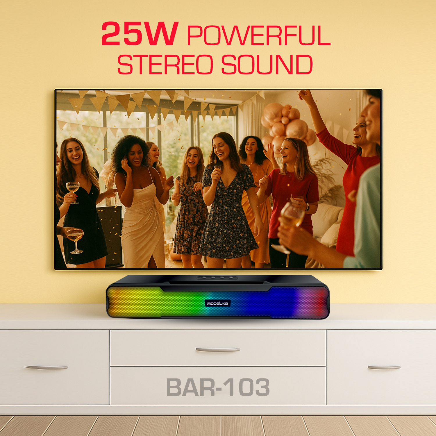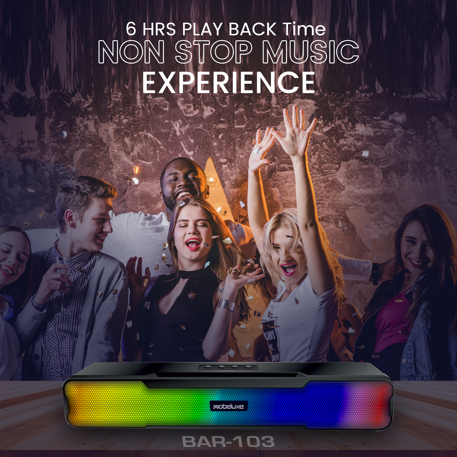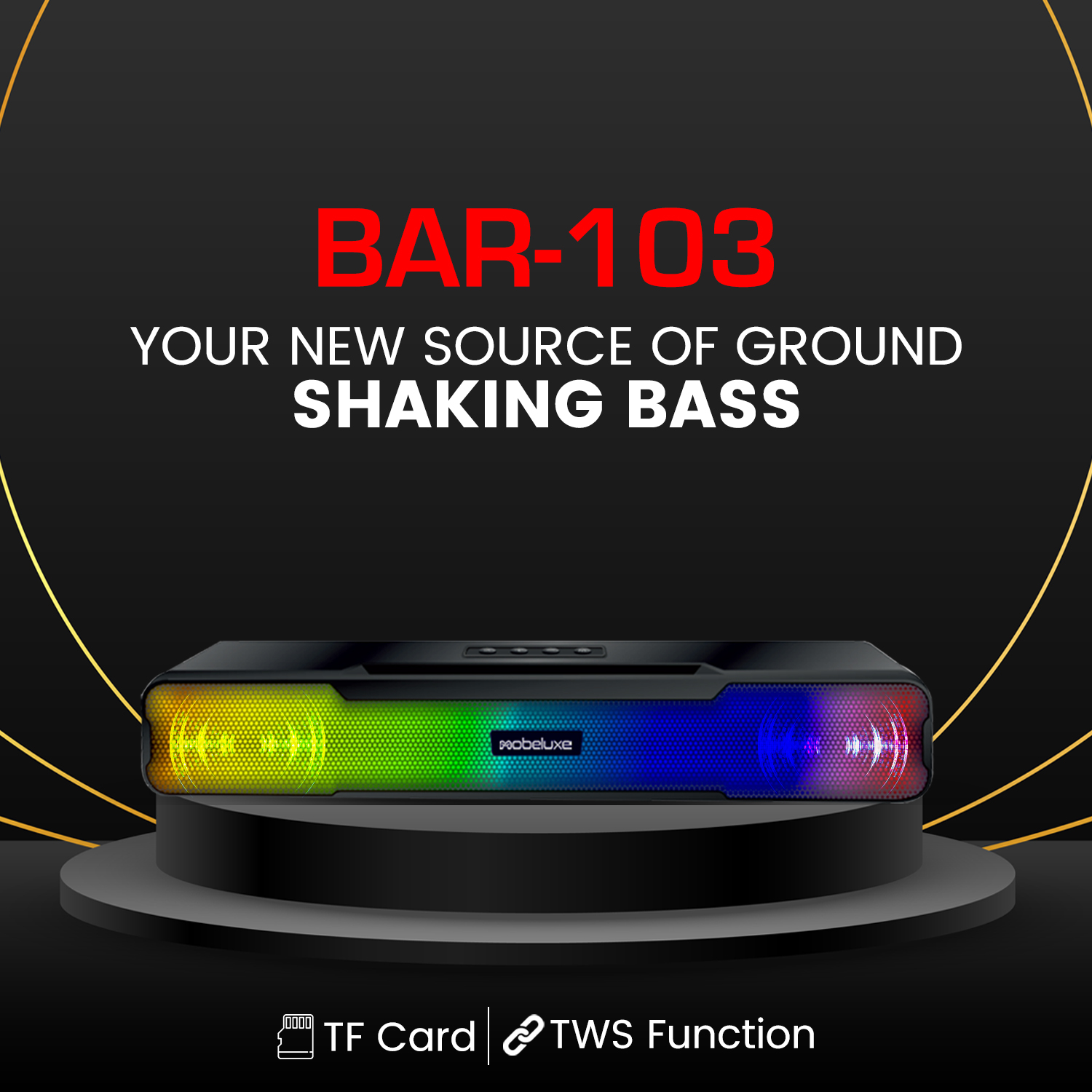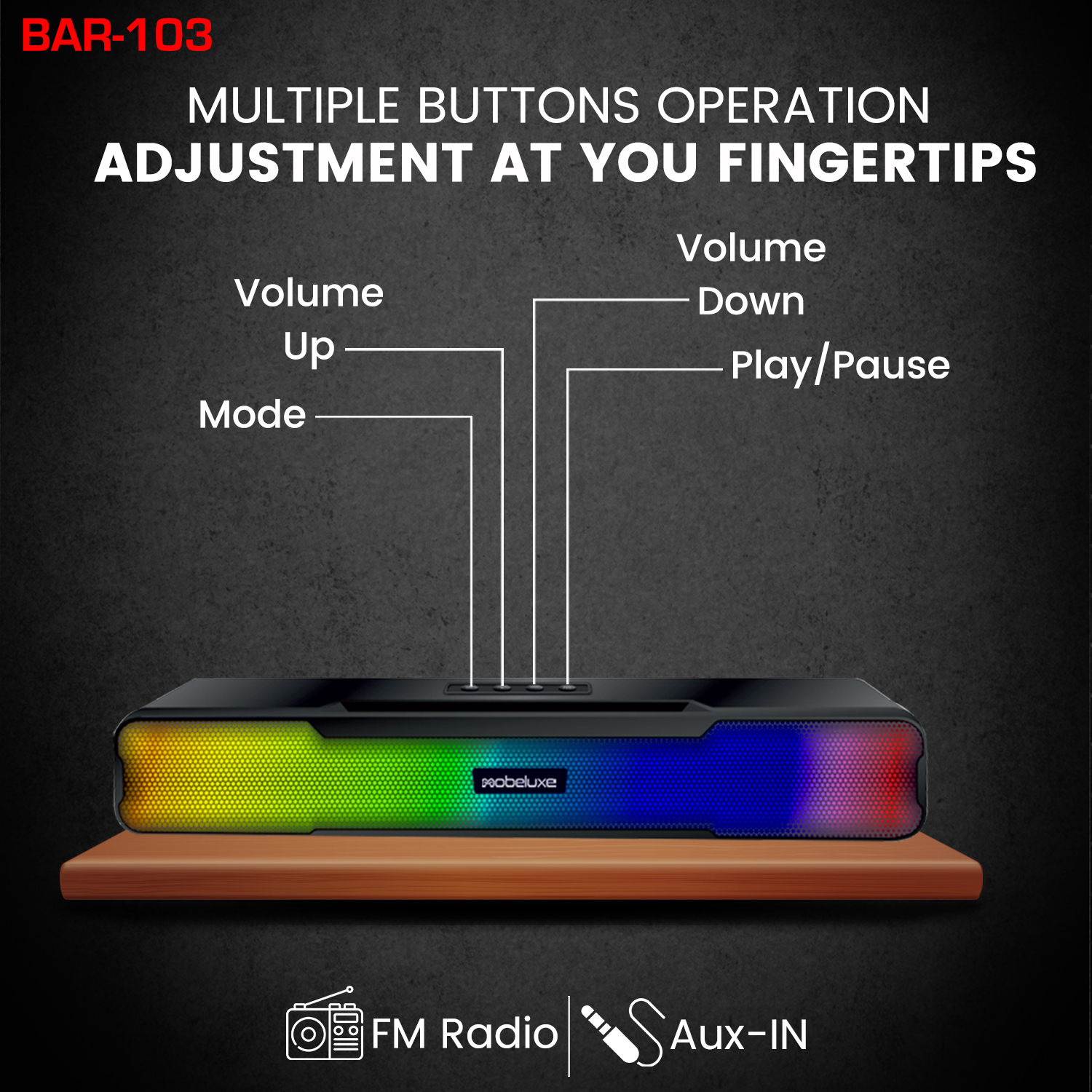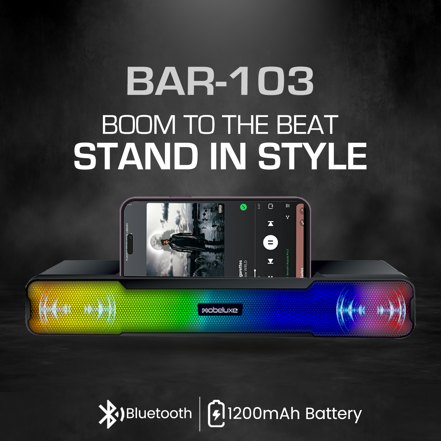 The BAR-103 is a compact wireless Bluetooth speaker that delivers powerful bass and immersive stereo sound. Its colorful RGB lighting adds a vibrant touch, making it perfect for parties or personal listening. Powered by a 1200mAh rechargeable battery, it provides up to 4 hours of playtime with a quick 2-hour charge. Sleek, portable, and feature-packed, the BAR-103 combines sound, style, and convenience, making it an ideal companion for music lovers on the go.