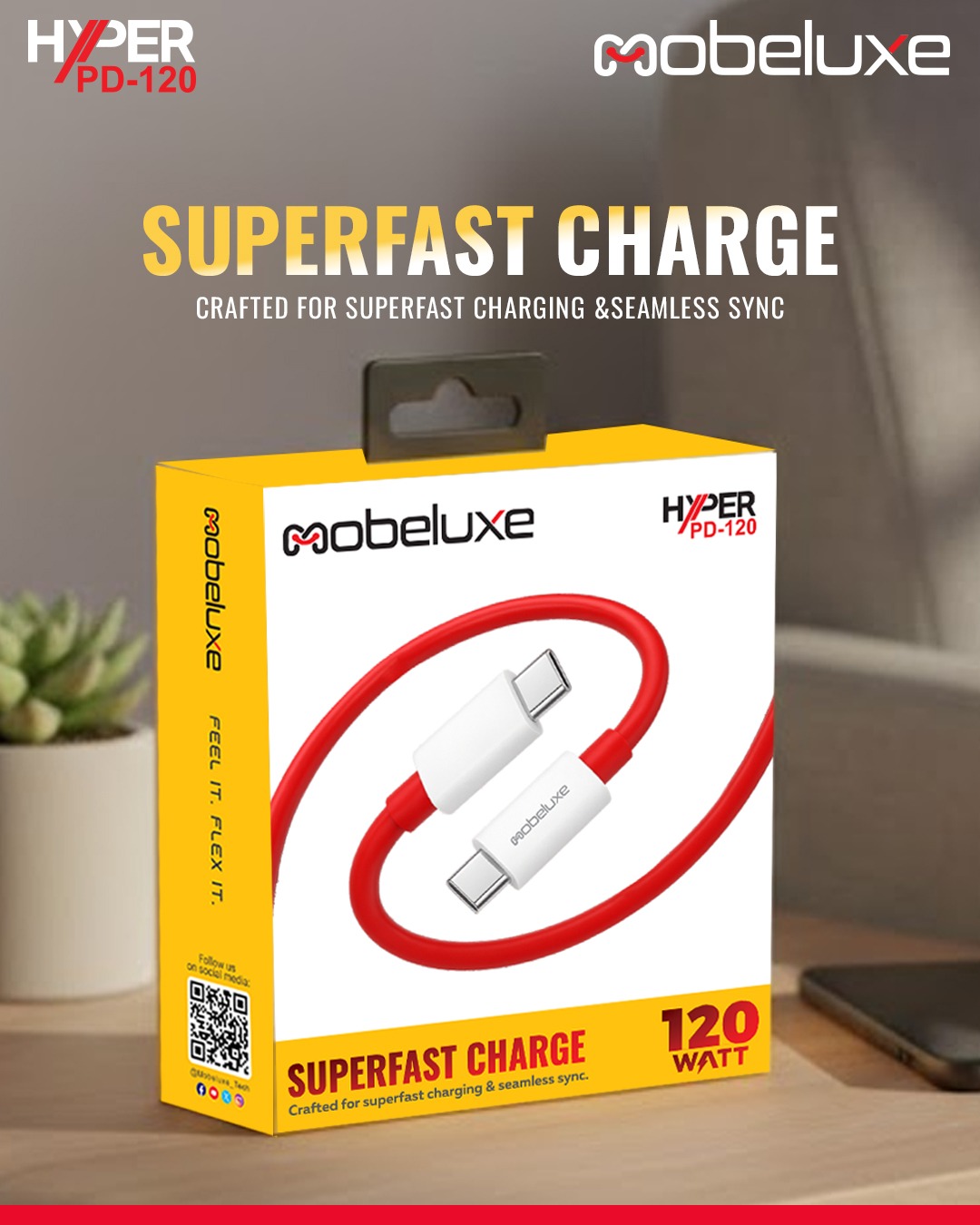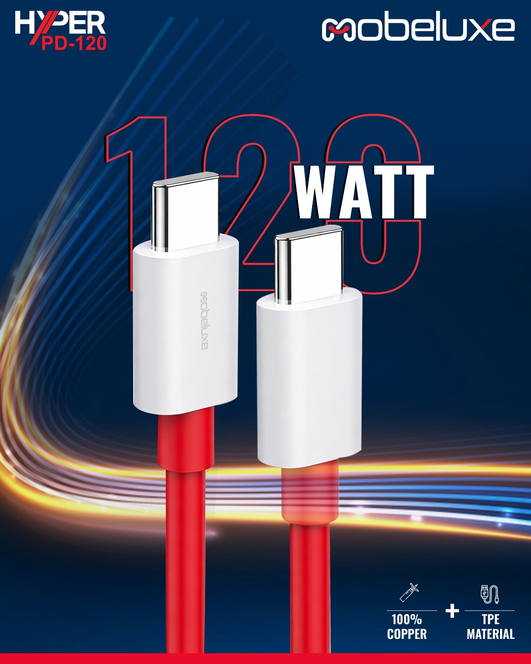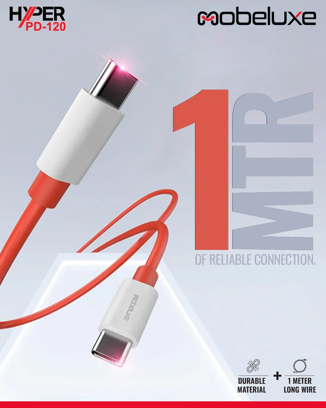 Mobeluxe Hyper PD-120 Data Cable, 120W fast charging, Type-C to C Cable, 1M Cable Length, Durable Material, Tangle free Design & Fast Charging.