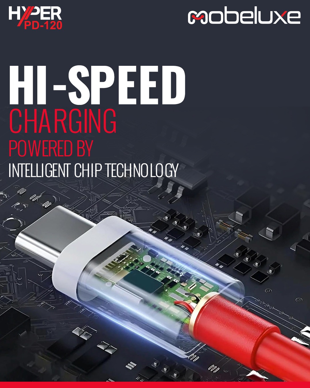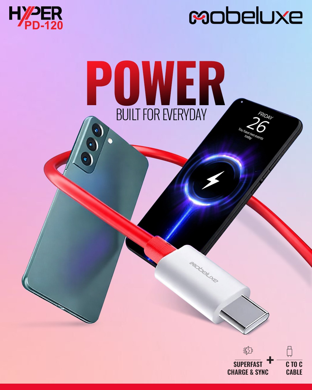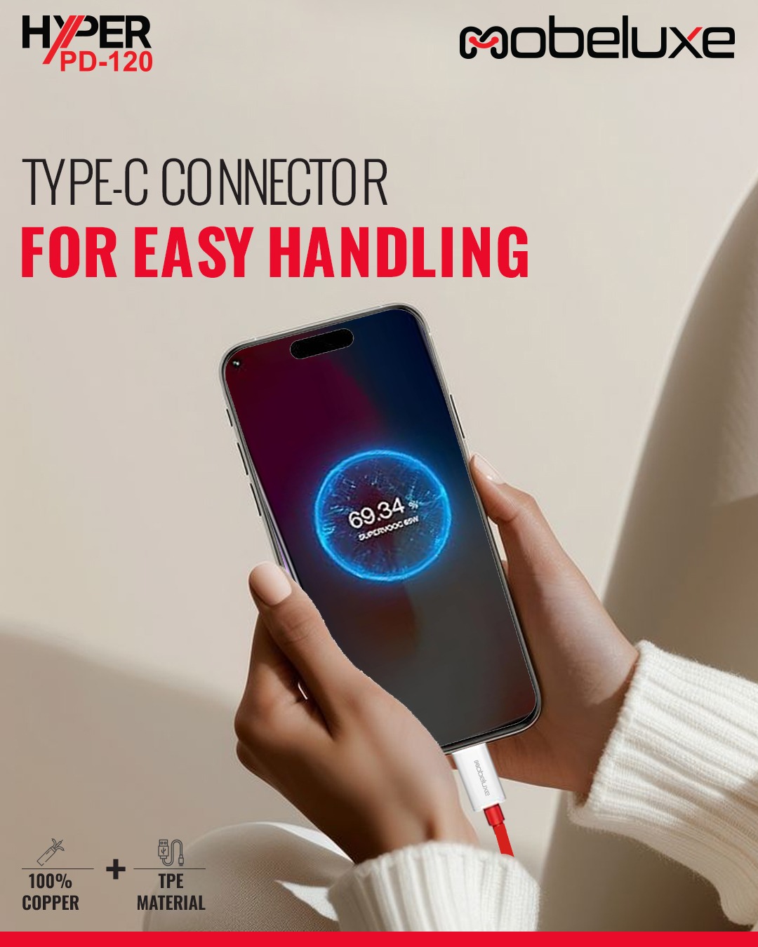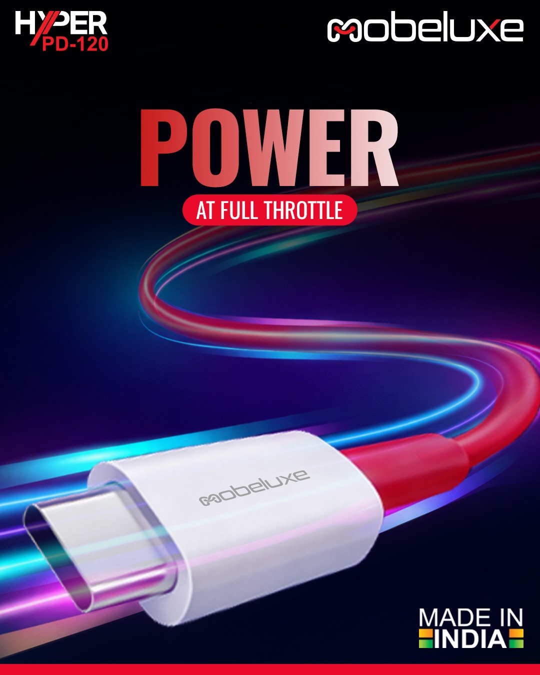 Mobeluxe Hyper PD-120 Data Cable, 120W fast charging, Type-C to C Cable, 1M Cable Length, Durable Material, Tangle free Design & Fast Charging.
